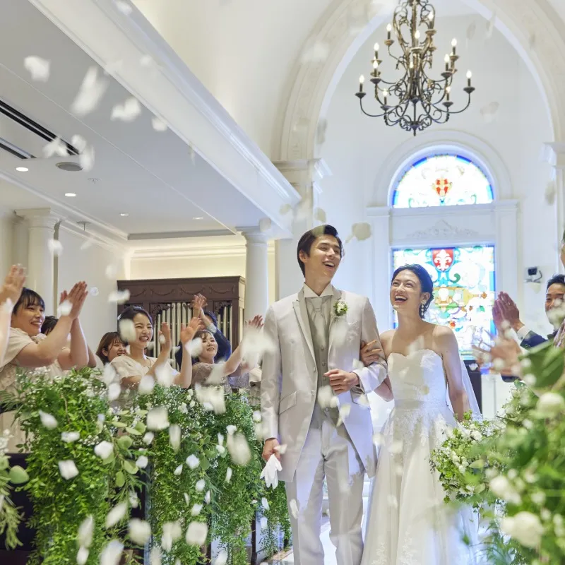 【選べる挙式スタイル】本物のステンドグラス輝く荘厳な大聖堂、または厳かな出雲大社から親御様も安心の「本格挙式」を選べます。本番さながらのチャペル入場体験で、感動的な誓いをリアルに体感してください。